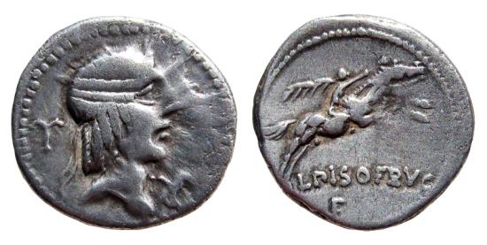 | Reign | L. Calpurnius Piso Frugi 90 BC., Roman Republic (family Calpurnia) | | Denomination | AR Denarius | | Date Struck | 90 AD. | | Mint | Rome | | Obverse | Laureate head of Apollo right, Y behind, Y below chin | | Reverse | Horseman galloping right, carrying palm, L PISO FRVG over F below | | Weight | 3.68 grams | | Diameter | 19/18 mm | | Reference | Crawford 340/1; Sydenham 665c; Calpurnia 11 | | Grade | Very fine, toned | | Comments | Struck with worn obverse die. | |