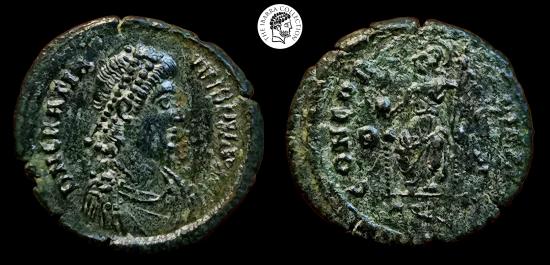 | Gratian. AE Follis. Antioch mint. 367-383 AD. Struck circa 378-383 AD. D N GRATIANVS P F AVG, pearl-diademed, draped and cuirassed bust of Gratian right / CONCORDIA AVGGG, Roma, helmeted, seating facing, looking left, right leg bare, holding globe and spear; Θ-Φ/K/ANTA. 18mm, 2.50g. RIC 45a. Nice green patina. Reverse weakly struck. Very Fine. |