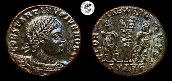 | Constantine II, as Caesar. AE Follis. Antioch mint. 316-340 AD. Deposits. EF. |