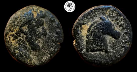 DECAPOLIS, Antiochia ad Hippum. Lucius Verus. 161-169 AD. Laureate head right / Horse's head right. AE. 15mm, 3.89g. Spijkerman 21; RPC IV.3 Online 6578; Rosenberger 17; Sofaer 22. Earthen brown patina. Near VF. Very rare, only three recorded in RPC, four in CoinArchives.