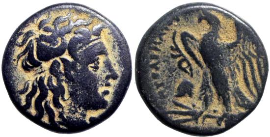 PTOLEMAIC KINGS of EGYPT. Ptolemy I Soter. As satrap, 323-305/4 BC, or king, 305/4-282 BC. Æ Hemiobol (19.5mm, 5.70 g, 12h). Alexandreia mint. Series 2B, circa 306-294 BC. Diademed head of the deified Alexander III right, with horn of Ammon / Eagle, wings spread, standing left on thunderbolt; to left, aphlaston above helmet. CPE B23; Svoronos 172; SNG Copenhagen 36–7. Attractive . VF. |