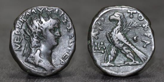 ROMAN EMPIRE: EGYPT, Alexandria. Nero. AD 54-68. BI Tetradrachm. Dated RY 11 (AD 64/5). Radiate head of Nero right / Eagle standing left with wings closed, palm-branch behind; date in left field, dot to right.