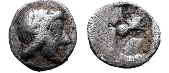 Ionia. Kolophon. AR Hemiobol. 500-480 BC. Head of Apollo.