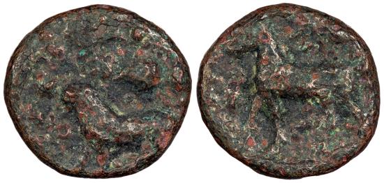Horse standing l.; star above, monogram (symbol of Tanit?) to l.