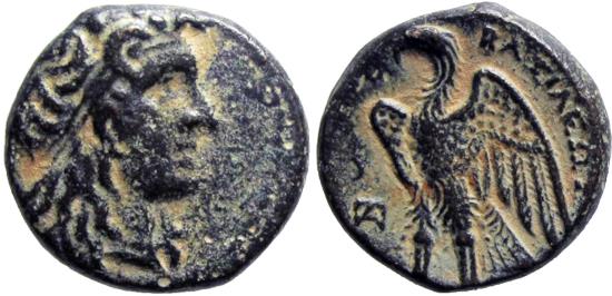 PTOLEMAIC KINGS of EGYPT. Ptolemy I Soter. 305/4-282 BC. Æ Hemiobol (15mm, 4.11 g, 12h). Tyre mint. Struck circa 294-282 BC. Diademed head of Alexander the Great right, with long hair, wearing horn of Ammon / Eagle standing left on thunderbolt; to left, club above ΠA monogram. CPE B134; Svoronos 630; SNG Copenhagen –. VF, |
