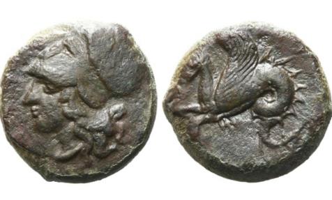 Obv: Head of Athena left, wearing Corinthian helmet decorated with wreath.