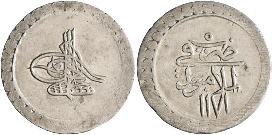 Ottoman: Mustafa III (1757-1774), silver kurush / 40 para (18.67g), Islambul (Istanbul) mint, accession year AH 1171 (1757 CE), RY 5.