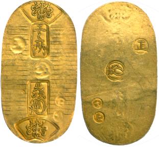 | Japan, Ansei (1859), gold Koban, fan-shaped Kiri crest at the top and bottom, with two Japanese characters in panel below with value, with characters in the second panel for the mint official. Rev. Sei stamp and seal stamps, 9.10g (JNDA 09-22; Fr. 16; KM C22c). Good Very Fine. Accompanied by a JNDA certificate. Extremely rare, a one year type. |
