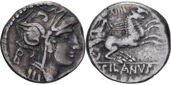 | | Junia, Denarius, 91 BC, Rome, Silver, , Crawford:337/3 | | | Helmeted head of Roma, right, control mark behind. Border of dots., Victory in biga, right, holding reins in both hands. Border of dots., D. Iunius Silanus., D·SILANVS·L·F ROMA | | FEATURES |