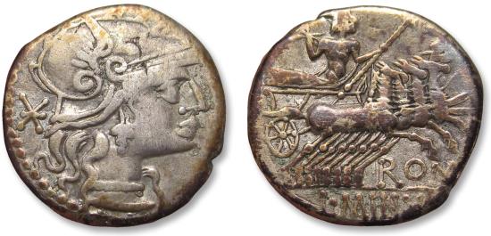 Jupiter driving galloping quadriga right, hurling thunderbolt and holding sceptre; ROMA below, L•MINVCI in exergue