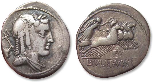 AR denarius L. Julius Bursio, Rome mint 85 B.C. - variety with bucranium symbol on obv, letters FV on rev -