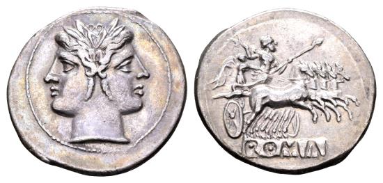 Rev.: Jupiter, holding sceptre and hurling thunderbolt, in fast quadriga to the right, driven by Victory; below: ROMA incuse on raised tablet.
