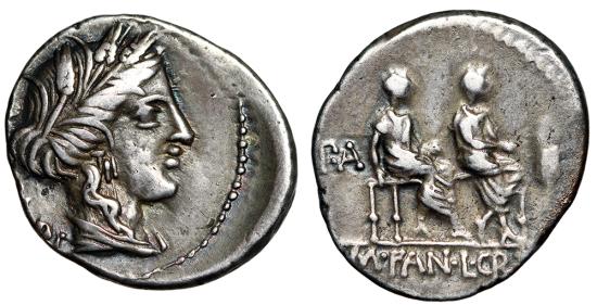 M. Fannius and L. Critonius AR Denarius Rome Mint 86 BC Obverse: Wreathed and draped bust of Ceres right Reverse: The aediles M. Fannius and L. Critonius, seated right on the subsellium; P(dot)A (publico argento) to left; grain ear to right; M FAN L CR+ in exergue References: Crawford 351/1; Sydenham 717 Size: 20mm, 3.71g Professional Numismatic Notes: Very fine with a marvelous old-collection tone!