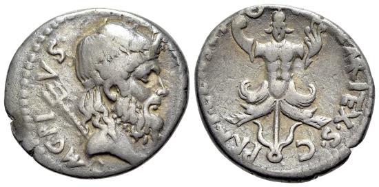 Sextus Pompey, 37/6 BC, Uncertain Sicilian mint. AR Denarius Head of Neptune R/ Naval trophy set on anchor