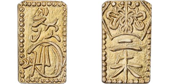 | | Japan, Kōmei, 2 Shu, Man'en, 1860-1869, Edo, Electrum, | | | 2 Shu "Man'en Nishukin"; Tokugawa Shogunate - Kōmei Tennō (1846-1867); KM C 18a, JNDA 09-44, DHJ 8.51., Electrum coin, with a gold fineness of around 229‰. | | FEATURES |