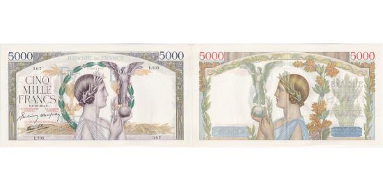 | | France, 5000 Francs, Victoire, 1941-10-09, E.705, AU(55-58) | | | Female personification of France in the center, turned to the right, laureate and draped, holding an olive branch in her right hand and a sphere surmounted by a winged Victory in her left hand. Behind, an olive wreath and, in the background, two bunches of wheat ears and oak branches above a bed of wheat and olive branches., Female figure of France in the center, turned to the left, laureate and draped, holding an olive branch in her left hand and a sphere surmounted by a winged Victory in her right hand. Behind her, intertwined oak and laurel branches and a bunch of wheat ears on the right; all flanked on either side by an olive branch and oak leaves behind the frame. Above, two laurel branches around which a snake coils, each biting the winged petasus in the center. | | FEATURES |