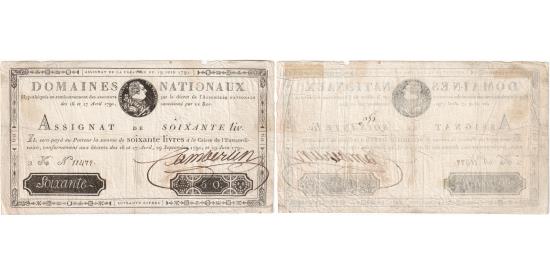 | | France, 60 Livres, 1791-06-19, 2K, VF(20-25) | | | Bust of Louis XVI on the right in a medallion at the top center, denomination in the center, serie and number of the banknote below on the left, signature on the right., Inscription in ink on the reverse "n° 51". | | FEATURES |