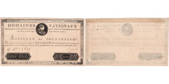 | | France, 200 Livres, 1791-09-12, C, AU(50-53) | | | Bust of Louis XVI on the right in a medallion at the top center, denomination in the center, serie and number of the banknote below on the left, signature on the right. | | FEATURES |