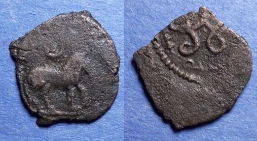Horse right, crescent with pellet above, all within a circle
