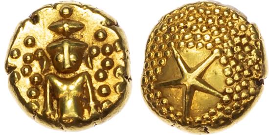 India, Madras Presidency, gold Star Pagoda, struck c. 1740-1807, Madras, Vishnu standing facing. Rev. Five-pointed star within granulated field, 3.37g (CEIC 1.11; Prid. 9; Fr. 1578). Extremely Fine.