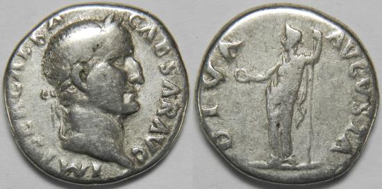 Roman Empire Galba AR Denarius (Rome, AD 68-69) Laureate head right / Livia standing left, holding patera and scepter. 3.43 grams, 17 mm. About Very Fine. Faint scratches. RIC 186, RSC 55. The line of the Julio-Claudian emperors had died out with Nero, but the new emperor Galba still wished to demonstrate continuity with the dynasty that had ruled for the last century, via his close friendship with Livia. |