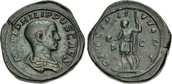Philip II Æ Sestertius As Caesar, A.D. 244-247 29.5mm, 30.76 g, 2h 3rd officina. 5th emission of Philip I, AD 246. Bareheaded and draped bust right / Philip II standing left, holding globe and reversed spear. RIC IV 256a; Banti 9. Nice dark green patina with golden highlights on obverse From the John Wright Collection. Ex CNG 299, lot 449 |