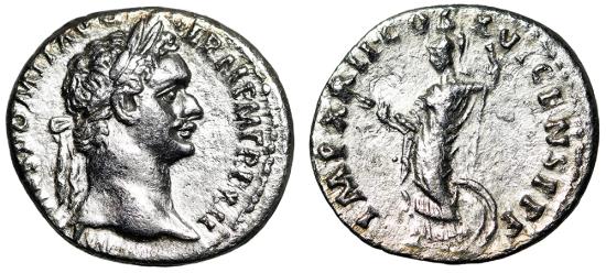 DOMITIAN AR DENARIUS Rome Mint 92-93 AD Obverse: IMP CAES DOMIT AVG GERM P M TR P XII Head of Domitian, laureate, right Reverse: IMP XXII COS XVI CENS P P P Minerva standing left, holding thunderbolt and spear; shield at side References: RIC 741 Size: 18mm, 3.12g Professional Numismatic Notes: Good very-fine with a strong portrait! Somewhat rough surfaces