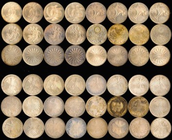 1972 Munich Olympic 10 Mark Coin Set (24 Coins).  KM 130-135 including all mint marks (D, F, G and J). Struck for the Munich Olympic Games in Germany in 1972 and struck in .625 silver (each coin has about 1/3rd ounce of pure silver; nearly 8 ounces of silver). All coins have deep multicolored toning from the original mint issued storage case.  As struck in the original case of issue.  Getting very scarce.