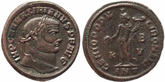 Maximianus part silvered follis. Minted: Antioch Obverse: IMP C M A MAXIMIANVS P F AVG, laureate bust right Reverse: GENIO POPVLI ROMANI, Genius standing left, modius on head, naked except for chlamys over left shoulder, holding patera from which liquid flows, and cornucopiae; B/V in right field, K in left; ANT in ex |