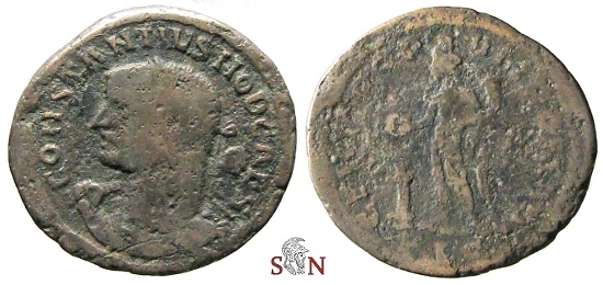 Constantius I. as Caesar Follis, struck AD 301-303 at Lugdunum mint. Obv: CONSTANTIUS NOB CAES, laureate and draped bust left, holding club over right shoulder. Rev: GENIO POPVLI ROMANI / A (in right field) / PLC (in exergue), Genius standing left before lighted