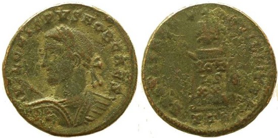 Obverse: IV LCRISPVS NOB CAES, Laureate bust left holding shield and spear forward