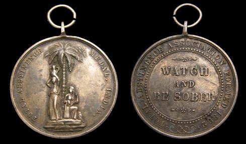 Description : Obv : A palm tree, centre, under which are two native women with water pots; one standing with pot on head and the other sitting. Around border : Total Abstinence Medal-India Rev : Within a beaded circle in centre : Watch and Be Sober. Around border : Total Abstinence Association. Formed 1862.