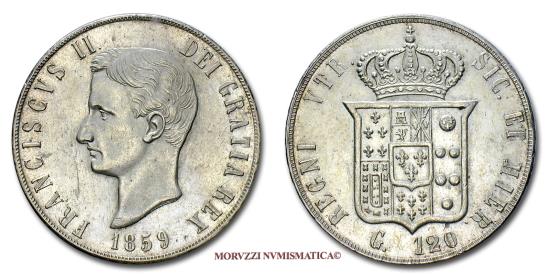 Kingdom of the Two Sicilies / Königreich beider Sizilien / Короле́вство обе́их Сици́лий / Koninkrijk der Beide Siciliën / Reino de las Dos Sicilias / Royaume des Deux-Siciles / Regno delle due Sicilie, Francis II of the Two Sicilies / Franz II. (Sizilien) / Франциск II (король Обеих Сицилий) / Frans II der Beide Siciliën / Francisco II de las Dos Sicilias / François II (roi des Deux-Siciles) / FRANCESCO II DI BORBONE, 1859-1861, 120 GRANA, Issue: 1859, Zecca di Napoli / / Mint of Naples (Neapel / Неа́поль / Napels / Nápoles), Rif. bibl. / References: Pagani, 481; Magliocca, 806; Metal: AG / AR / SILVER / SILBER / Серебро (Serebryanyy) / Zilver / PLATA / ARGENT, Weight: gr. 27,63, (MZ133396), Diam.: mm. 37,20, SPL / EF (55/70) Leggera satinatura originale. / Light original satin. |