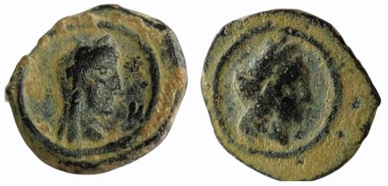 NABATAEA. Aretas IV, withHuldu. 9 BC-AD 40. Æ (10.9mm, 1.2 gll). Petra mint. Laureate head of Aretas right; / Veiled and draped bust of Huldu right; H (in Nabataean) to right. Meshorer, Nabataea 122