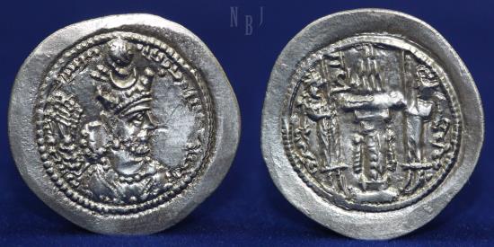 Vahram (Bahram) V. AD 420-438. AR drachm .Mint: AS (Aspanvar) mint. Bust right, wearing mural crown with korymbos set on crescent. Rev. Fire altar flanked by two attendants.