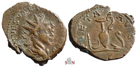 Rev: PIETAS AVGG, Sacrificial implements, spinkler, simpulum, jug with handle to right and lituus. 3,75 g, 20 mm. RIC 254; Elmer -; AGK (corr.) 4b; Mairat -; double striking on obverse. extremely rare type with long obverse legend (instead of C P E TETRICVS
