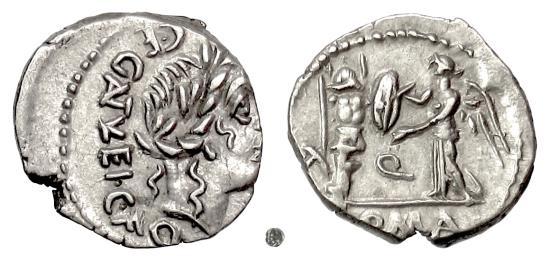 Laureate head of Apollo; Q (mark of value) below / Victory standing left, inscribing shield attached to trophy; Q between