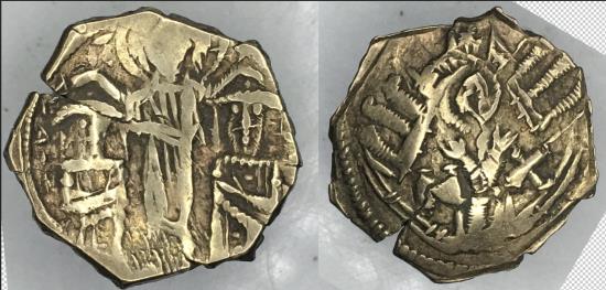 TCBYZG-1714, ANDRONICUS II and ANDRONICUS III, AE 3.46 gm 19.38 HYPERON, 1325-1328 AD. Obv: Bust of virgin praying within city walls.  Rev: ANDRONICUS II and III kneeling on either side of Christ. SMALL HEAVY FLAN. SEAR-2461.  GRIESON-1294. aVF