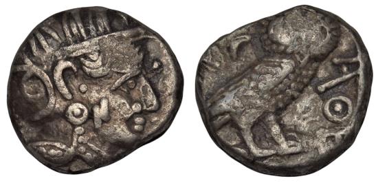 ANCIENT ARABIA, Southern. Saba'. Circa Late 4th–mid 2nd centuries BC. AR n?f – Unit ( 5.22 g). Imitating Athens. Helmeted head of Athena right; N (in retrograde South Arabian; mark of value) on cheek / AΘE Owl standing right, head facing; [olive spray] and crescent to left. Van Alfen, Studies, SII.A; CAF 1.1ai; Huth 160–9. Lightly toned, VF.