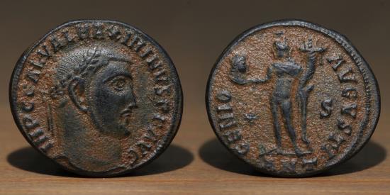 Maximinus II, Caesar, A.D. 305-309, AE Follis Roman Empire, Antioch mint. Obv: "IMP C GAL VAL MAXIMINVS P F AVG"; Maximinus II busted to right. Rev: "GENIO AVGVSTI"; Genius, modius on head, naked but for chlamys hanging from shoulder, holding head of Sol and cornucopia, "ANT" in exergue; "STAR" in left field, "S" to right. Weight: 4.84gm Size: 21.8mm Nice Sand Patina, About EF.