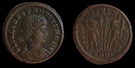 337-361 AD. FL IVL CONSTANTIVS NOB C, laureate, draped, cuirassed bust right / GLOR-IA EXERC-ITVS, two soldiers holding spears and shields with one standard between them with O on banner. Mintmark: SMNΓ RIC VII Nicomedia 201. Extremely Fine & Rare. Not so many of these are around in this condition.
