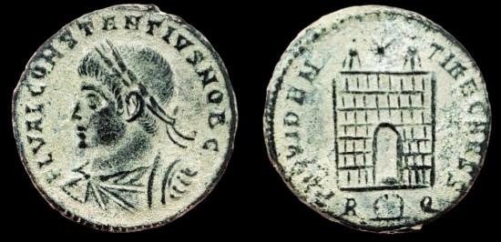 Constantius II, as Caesar, BI Nummus. 3.22g, 19mm. Rome mint, 326 AD. FL VAL CONSTANTIVS NOB C, laureate, draped and cuirassed bust to left / PROVIDENTIAE CAESS, camp gate with two turrets, no doors; star above, R(wreath)Q in exergue. RIC VII 290. Very Fine. Beautiful Patina.