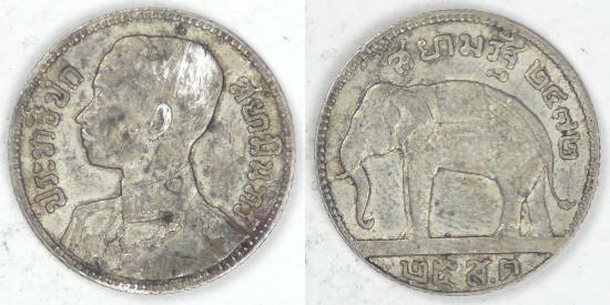 Rev: Elephant left with “Siam 2472” above and denomination below