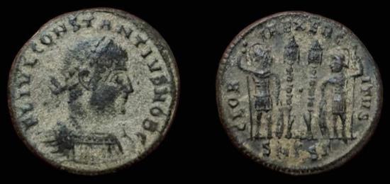Constantius II Caesar Thessalonica Mint 330-335 AD. Obverse: FL IVL CONSTANTIVS NOB C, laureate and cuirassed bust right Reverse: GLOR-IA EXERC-ITVS, two soldiers, each holding spear and shield on ground, flanking two standards, SMTS(gamma) in exergue References: RIC 185 19mm, 2.72g. Very Fine.