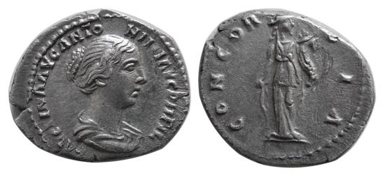 PCW-R5243-ROMAN EMPIRE; Faustina II. 149-152 AD. AR Denarius (2.98 gm; 20 mm). Rome. FAVSTINA AVG ANTONINI AVG PII FIL, Draped bust of Faustina II right, Rev: CONCORDIA, Concordia standing right holding cornucopia. RIC 500b. Well struck on a nice broad flan. Lovely style. Choice Good EF. Toned.