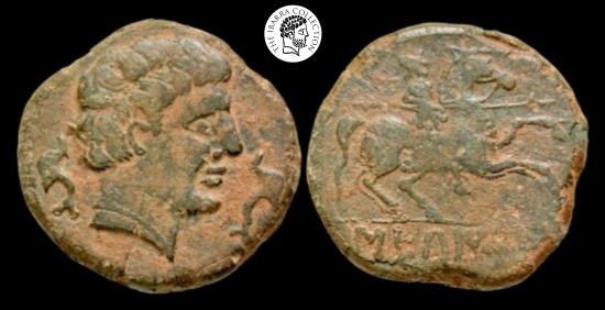 Iberia, Sekaisa. Ca. 100 B.C. AE 22 (22.6 mm, 8.60 g, 7 h). Bare male head right between two dolphins / 'Sekaisa', Warrior on horseback right, holding spear. ACIP 1559; SNG BM Spain 852. VF, green patina with earthen highlights.