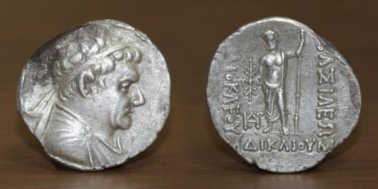 BAKTRIA KINGDOM, Greco-Baktrian Kingdom. Heliokles, circa 145-130 BC. AR Tetradrachm. Attic standard. Diademed and draped bust of Heliokles to right. / "ΒΑΣΙΛΕΩΣ ΗΛΙΟΚΛΕΟΥΣ ΔΙΚΑΙΟΥ"; Zeus standing facing, holding winged thunderbolt in right hand and long scepter with left; to left, monogram of "KΔHP".