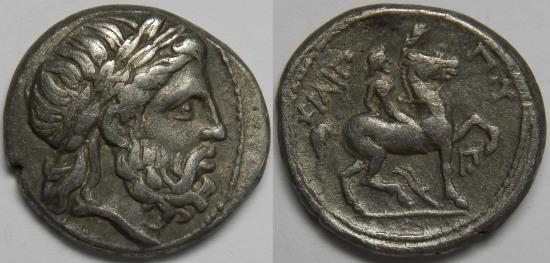 Laureate head of Zeus to right / ΦΙΛΙΠ ΠΟΥ, Young jockey, holding palm frond in his right hand and reins in his left, riding horse to right; below horse, aphlaston; below raised foreleg, pellet-in-Π.