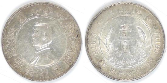 Obv: Bust of Sun Yat-sen left surrounded by Chinese ideograms, “Republic of China” above and “Founding commemorative coin” below