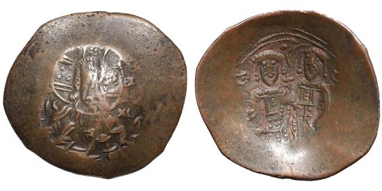 ALEXIUS III. 1195-1203 AD. Billon Trachy. 3.20 gr. – 27,4 mm. Constantinople mint. KERO H ΘEI, nimbate facing bust of Christ / Alexius and St. Constantine standing, holding globus cruciger between them. DOC IV 3c; SB 2012. VF+